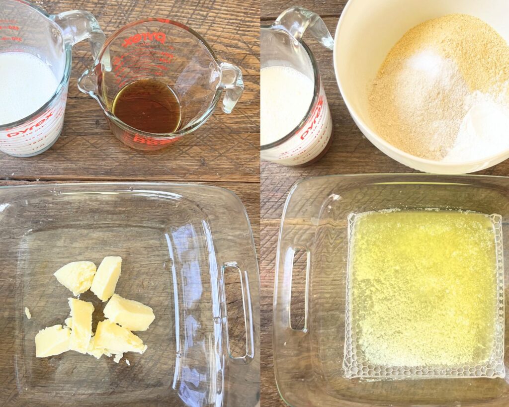 - Preheat Oven to 425º F and place a 9x9 dish with butter in it in the oven for it to melt