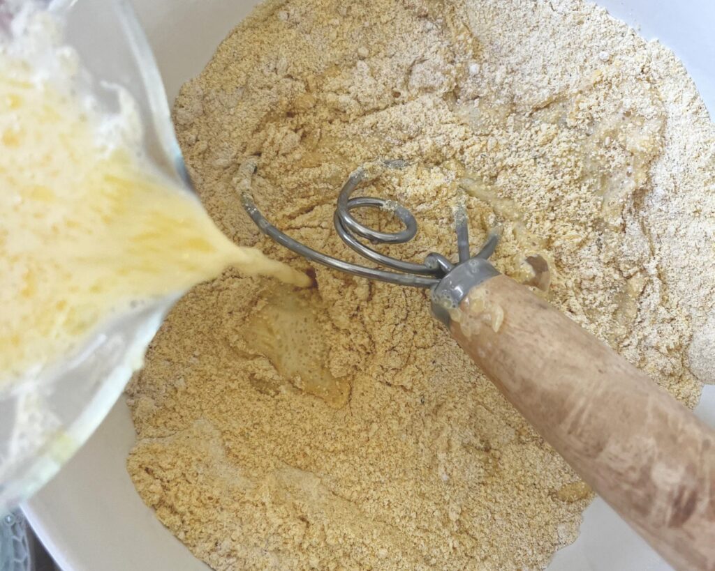 - Add the wet ingredients to the medium bowl of dry ingredients and whisk until the flour is combined