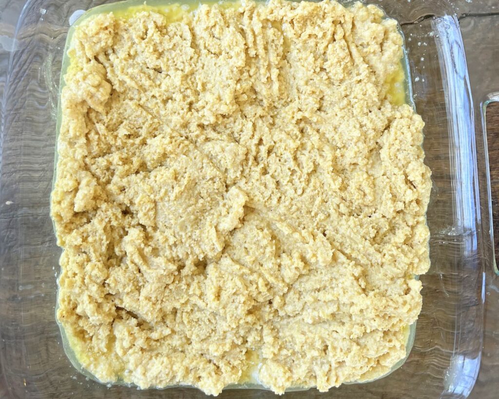 Pour the batter into the prepared and buttered dish using a spatula or fork to press it down and smooth it out