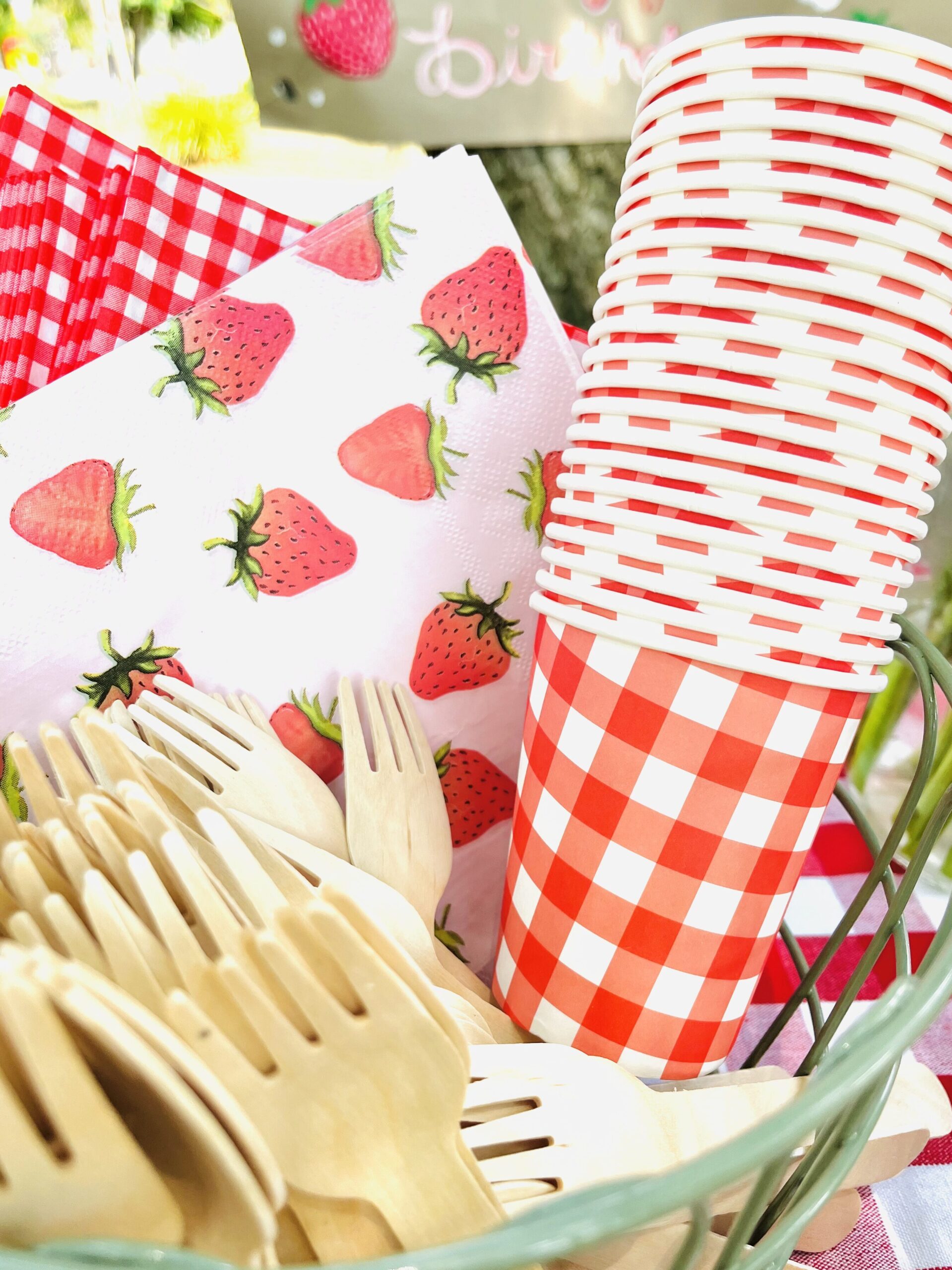 For the classic picnic feel, I chose a lot of red gingham prints paired with just enough strawberry themed items to make it come toghether nively. The hints of brown showed up and I loved the way it looked with the red and pink color scheme.